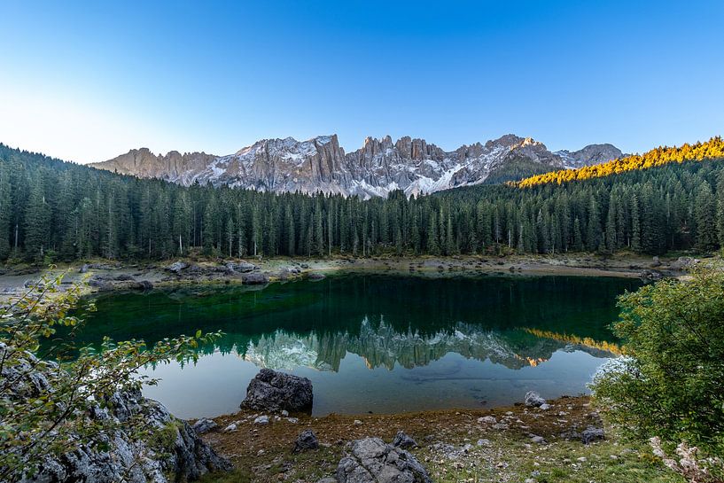 Achetez cette photo Panorama du lac Karersee dans les Dolomites dans la lumière du petit matin par Lex van Doorn sur toile, aluminium, ArtFrame ou photographie (encadrée), impression d'art en haute qualité et tout format.