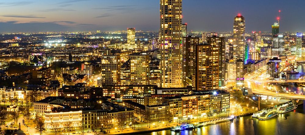 Panorama nocturne de la ville de Rotterdam sur la Nieuwe Maas