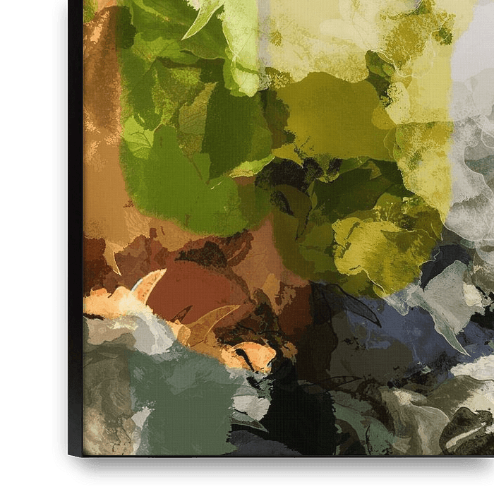 Art botanique numérique abstrait moderne. Paysage d'été avec feuillage abstrait dans des couleurs vertes, des tons de terre doux, de la terre cuite et du marron. Arbres ensoleillés, brise d'après-midi, vibrations estivales. Formes organiques, textures douces, coups de pinceau délicats. Scandinave, japonais, design, moderne,…