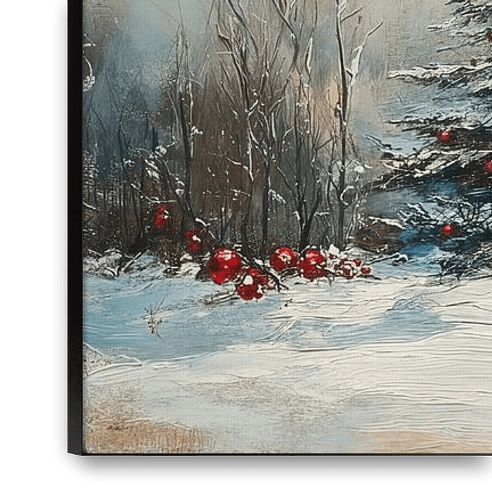 Paysage de Noël - Scène de Noël enneigée - Cette peinture de Noël montre une boule de Noël rouge vif suspendue à une branche d'épicéa entourée d'une couche de neige blanche, avec de subtiles touches de baies rouges et un arbre de Noël enneigé à l'arrière-plan, créant un paysage hivernal paisible.