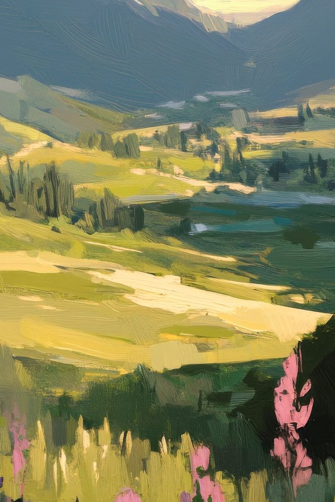 Un doux paysage de collines s'étend, parsemé de fleurs sauvages lumineuses aux douces nuances de rose et de mauve. De doux rayons de lumière jettent un éclat chaleureux sur les montagnes majestueuses en arrière-plan, créant une atmosphère harmonieuse. Cette œuvre d'art convient parfaitement au salon et confère à la pièce une note calme…