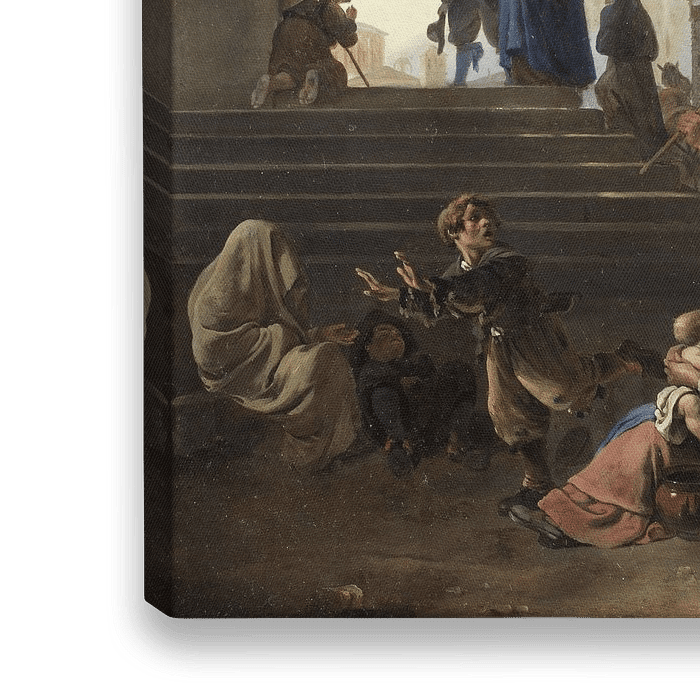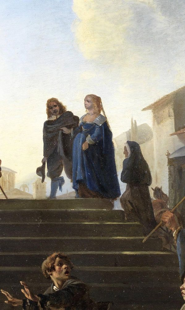 Paysans devant les marches de l'église, Anton Goubau Anton Goubau ou Anton Goebouw était un peintre baroque flamand. Il a séjourné à Rome où il a évolué dans le cercle des Bamboccianti, des peintres de genre hollandais et flamands qui créaient de petites peintures de cabinet sur la vie quotidienne des classes inférieures à Rome et dans sa campagne. Il est connu pour ses paysages italiens et ses peintures de genre dans le style des Bamboccianti, ainsi que pour ses peintures d'histoire aux thèmes mythologiques et religieux.
