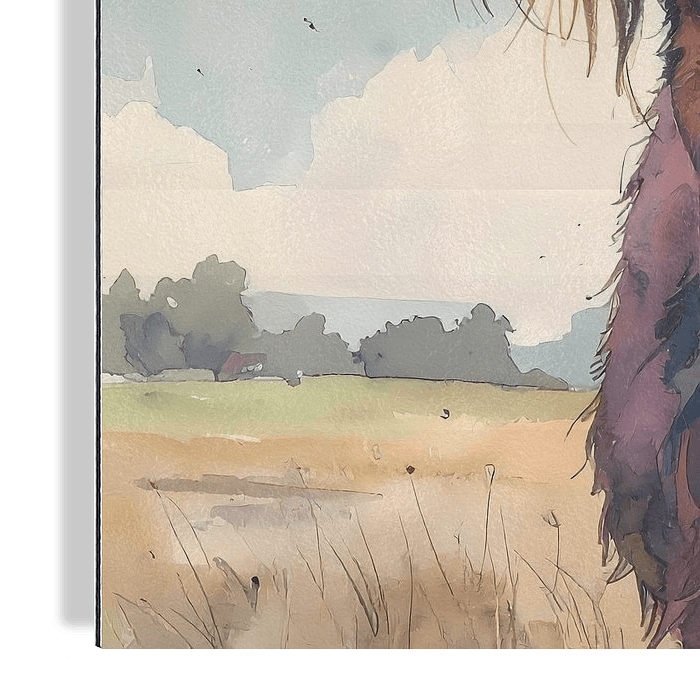 Tête de highlander écossais de style rétro, finition mate, highlander robuste avec une tête solide et de belles cornes. Le highlander écossais se tient dans un champ, avec en arrière-plan un ciel nuageux.