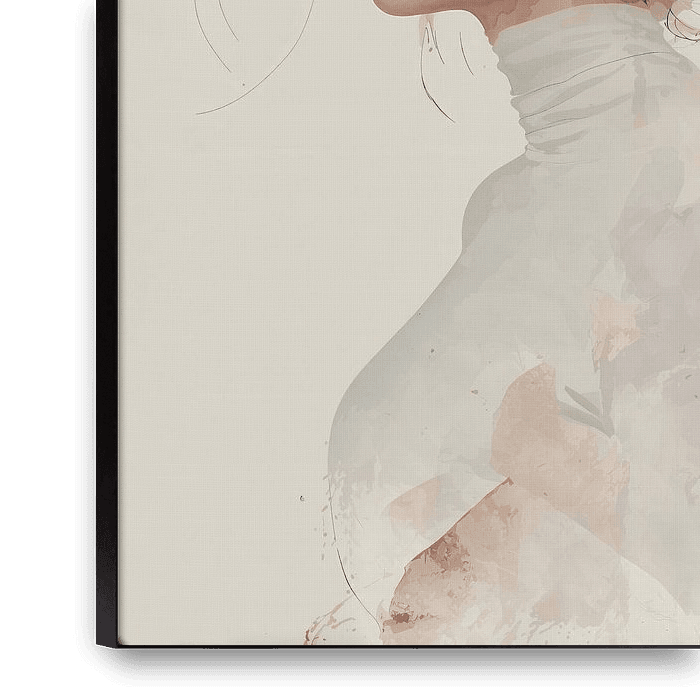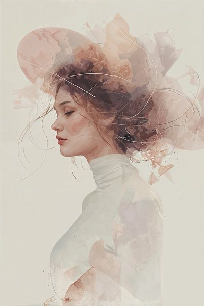 Une peinture numérique où une figure féminine se fond dans une brume aux douces nuances roses et brunes, évoquant l'aquarelle. L'œuvre oscille entre portrait et abstraction, où lignes délicates et formes géométriques saisissent des émotions subtiles. Le visage se métamorphose en un paysage émotionnel où pensées et rêves se confondent…