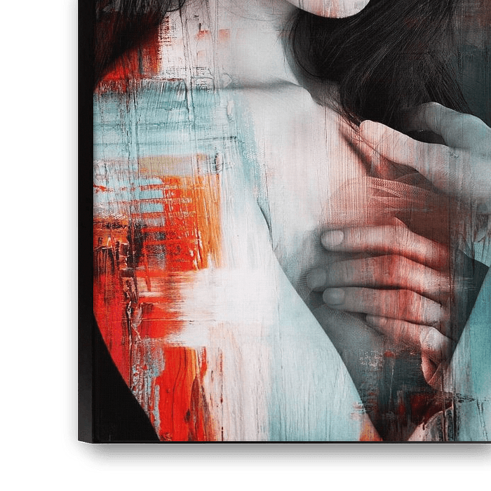 Portrait d'une femme réfléchie en peinture à l'huile noire, blanche et rouge. Grâce à la combinaison de couleurs, cette œuvre se prête parfaitement à un intérieur chaleureux.