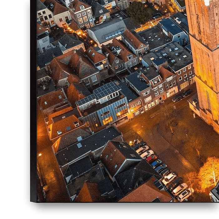 Le centre-ville de Zwolle au coucher du soleil, vu d'en haut lors d'un après-midi d'hiver au clocher de Peperbus de la Basilique Onze Lieve Vrouw Tenhemelopname.