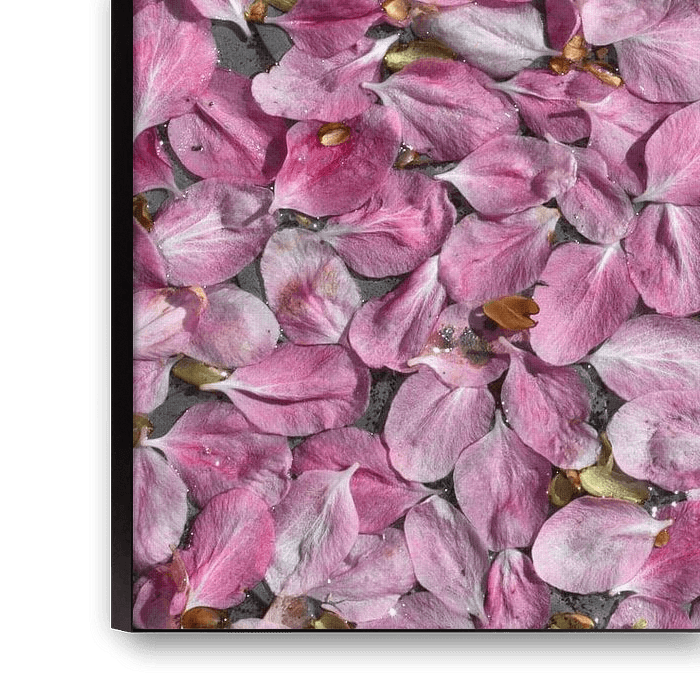 Des pétales roses flottant dans une flaque d'eau sur les plaques de recouvrement grises des conteneurs à déchets dans les rues d'Amsterdam.