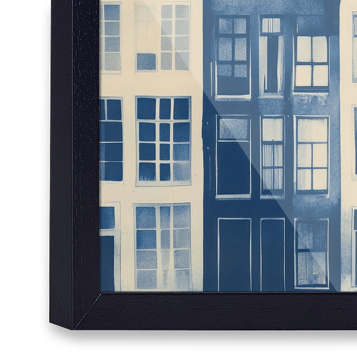Une œuvre d'art élégante d'un bleu de Delft profond qui capture les façades caractéristiques des maisons des canaux d'Amsterdam dans une atmosphère intemporelle. Les transitions semblables à de la peinture et la palette de couleurs monochromes lui confèrent une touche poétique et nostalgique. Cet imprimé est une ode à l'architecture et…