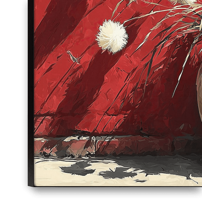 Ivory Pom - Ce tableau de fleurs représente une nature morte saisissante avec des fleurs à pompons blancs duveteux dans un vase en céramique beige vieillie sur un mur rouge foncé mat, peint dans un style moderne de peinture à l'huile avec des ombres claires et des tiges vertes fraîches, idéal comme tableau de fleurs ou pour peindre des fleurs au-dessus du canapé dans un intérieur moderne.