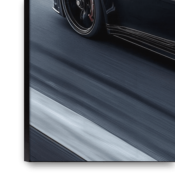 Un poster impressionnant d'une Porsche 911 GT3 noire. La carrosserie brillante reflète subtilement la lumière, tandis que les étriers de frein rouges ajoutent un accent puissant. La voiture roule sur une route déserte, avec des silhouettes de montagnes en arrière-plan, et respire la vitesse et le mystère. Un mélange parfait d'élégance…