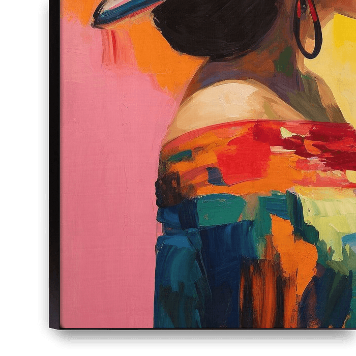 Portrait Femme florale - Ce portrait vibrant et contemporain se distingue par ses coups de pinceau expressifs et sa riche palette de couleurs. La femme représentée, en profil, porte un chapeau élégant orné d'une multitude de fleurs qui contribuent à un look estival chaleureux. L'utilisation des couleurs est audacieuse, les teintes vives…