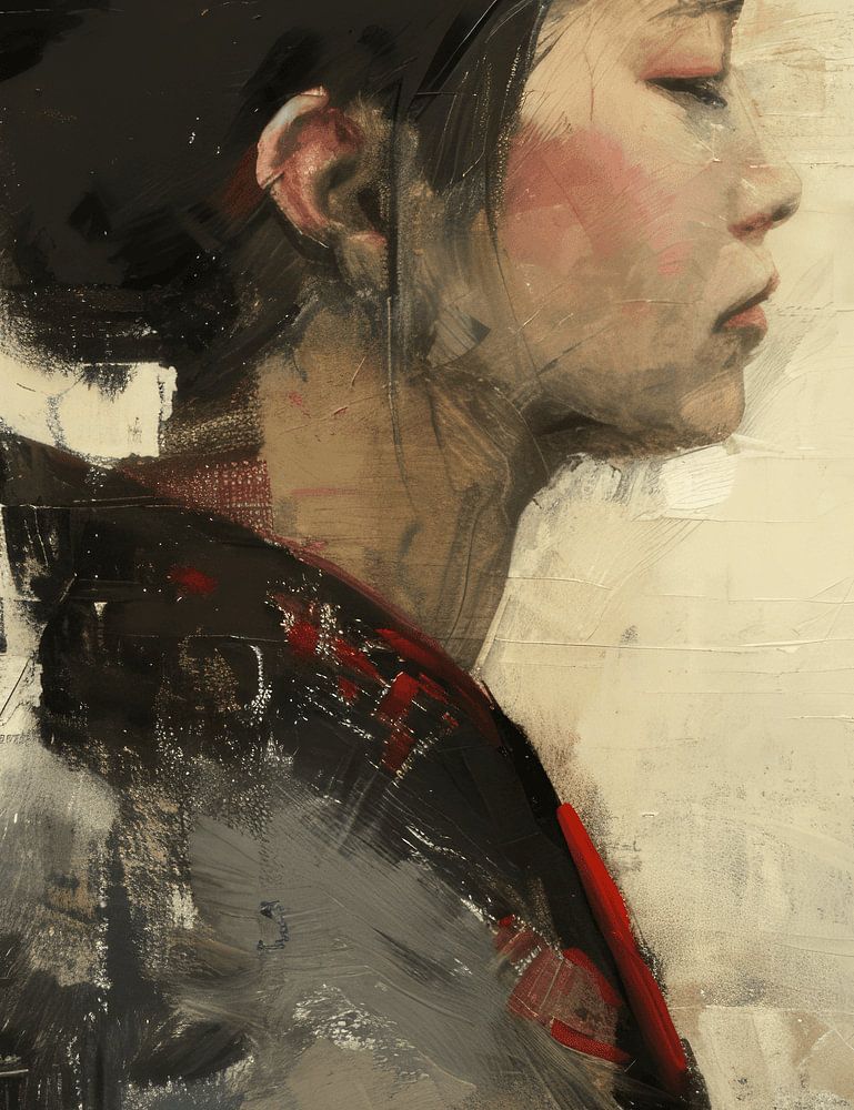 Portrait d'une femme asiatique dans des tons neutres. Choisissez la taille et le matériau de cette œuvre et faites-en un véritable accroche-regard pour votre intérieur.
