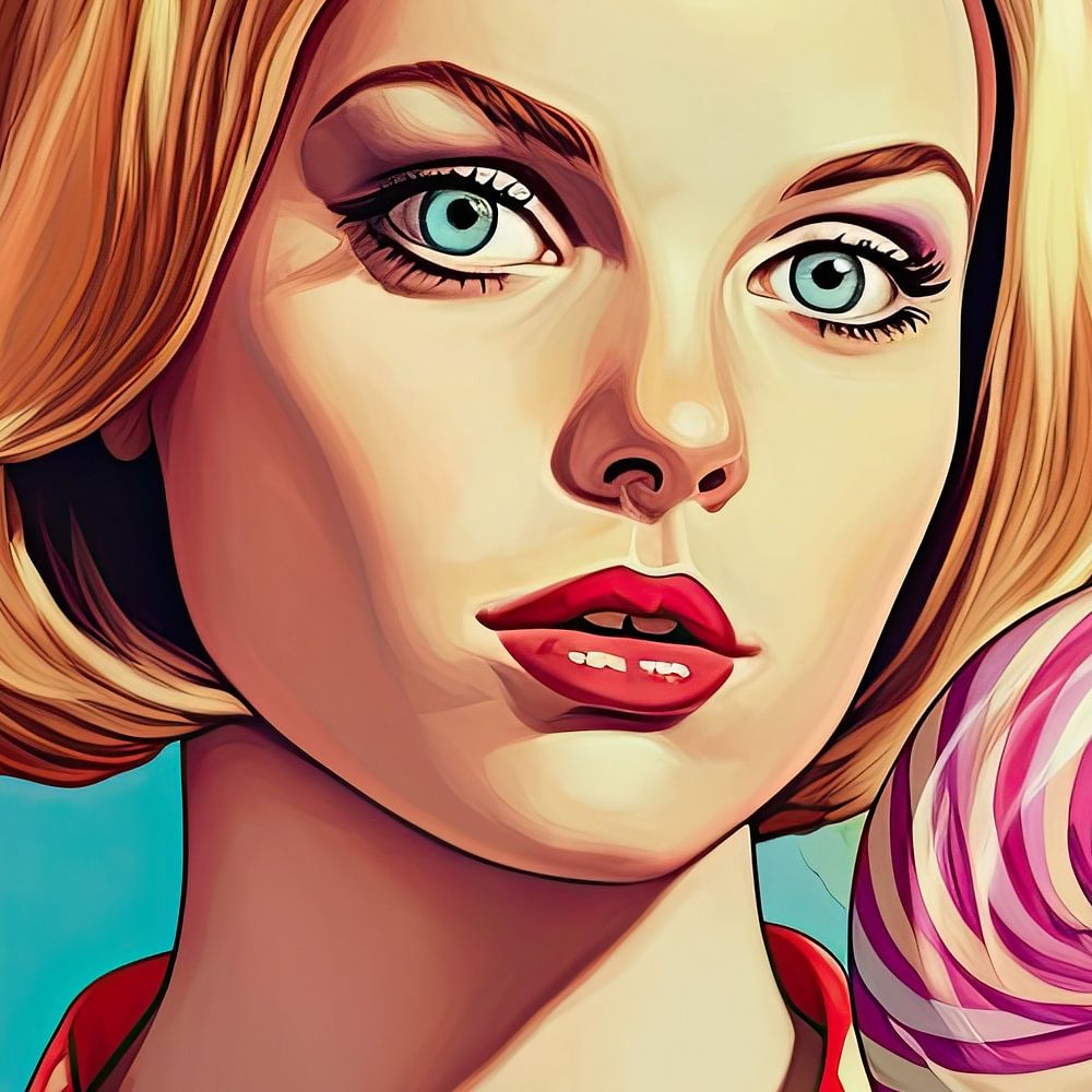 L'ambiance générale du dessin est vivante, ludique et colorée. Le portrait de la jeune femme avec la sucette rose et blanche comme accroche-regard respire la joie et l'énergie, ce qui est caractéristique du style pop art.