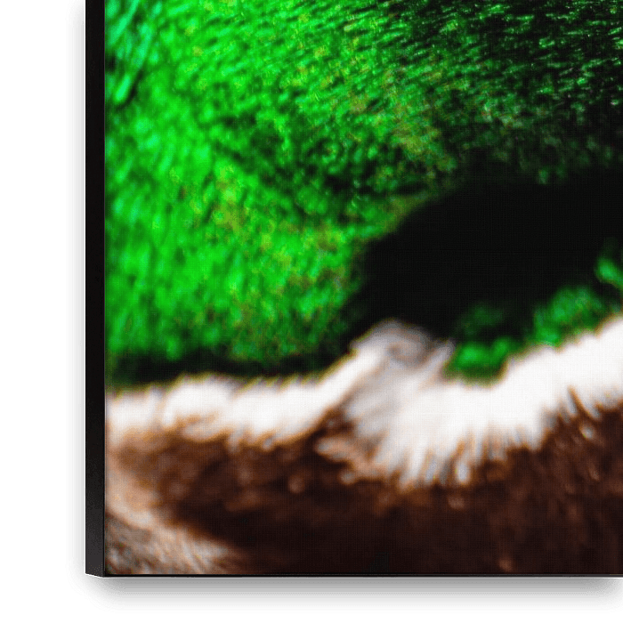 Portrait macro de la tête d'un canard colvert mâle avec un bec jaune et un plumage vert.