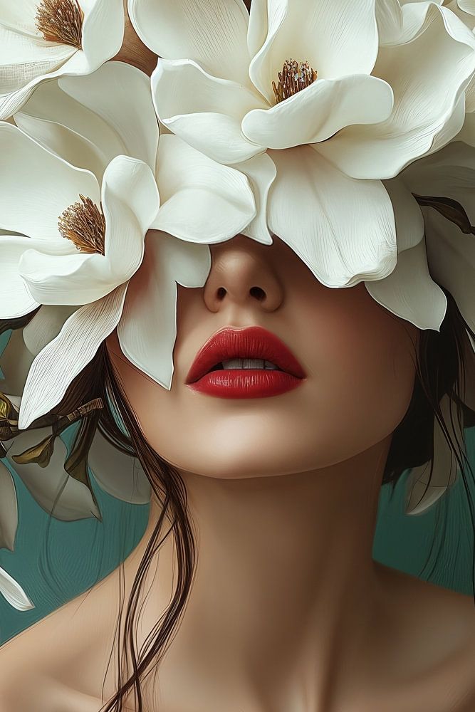 Un portrait artistique à couper le souffle où des magnolias blancs luxuriants se confondent avec des tons chair doux sur un fond turquoise serein. Les lèvres rouges forment un contraste puissant avec les fleurs délicates, tandis que la robe à épaules dénudées rayonne d'une élégance intemporelle. L’image équilibre parfaitement entre douceur romantique et drame moderne.