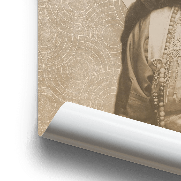 Portrait vintage d'une femme bhoutanaise en habits traditionnels. Inspiré d'une photo vintage (Femme bhoutanaise, Theodor Paar, c. 1895 - c. 1915 Rijksmuseum). Collage moderne avec motif géométrique japonais dans un style rétro. Style d'intérieur zen, rétro, moderne chic, japonais, minimaliste, asiatique, bohème.