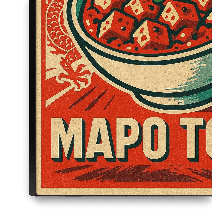Cet audacieux poster Mapo Tofu célèbre l'un des plats les plus célèbres du Sichuan dans un style rétro saisissant. Avec un bol de sauce chili rouge fumante, des cubes de tofu et des oignons verts, le design incarne les épices, la chaleur et la saveur de l'authentique cuisine chinoise. Avec des rouges audacieux, des tons verts vintage et…