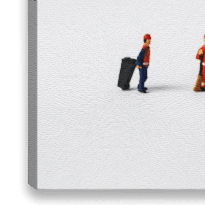 De petits personnages miniatures effectuent l'entretien d'un modèle en plâtre d'une série de dents. Avec un marteau, un marteau-piqueur et d'autres outils, ils semblent être à l'œuvre. Au loin, deux personnes attendent avec une poubelle à roulettes de venir nettoyer le désordre.