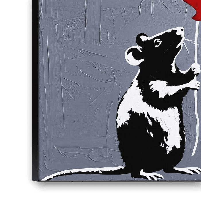 Ce dessin unique représente un adorable rat tenant un ballon en forme de cœur, clin d'œil au style emblématique de Banksy. Les couleurs simples et le contraste puissant entre le noir, le blanc, le gris et le rouge vif créent une composition visuellement attrayante, à la fois subtile et expressive. Cette œuvre d'art apporte une atmosphère ludique à n'importe quel espace tout en ajoutant une touche de street art moderne à votre intérieur. Parfait pour les amateurs d'art unique et audacieux, que ce soit pour décorer un salon, un bureau ou tout autre espace créatif. Cette peinture dégage du caractère et du charme et attire tous les regards dans n'importe quel environnement.