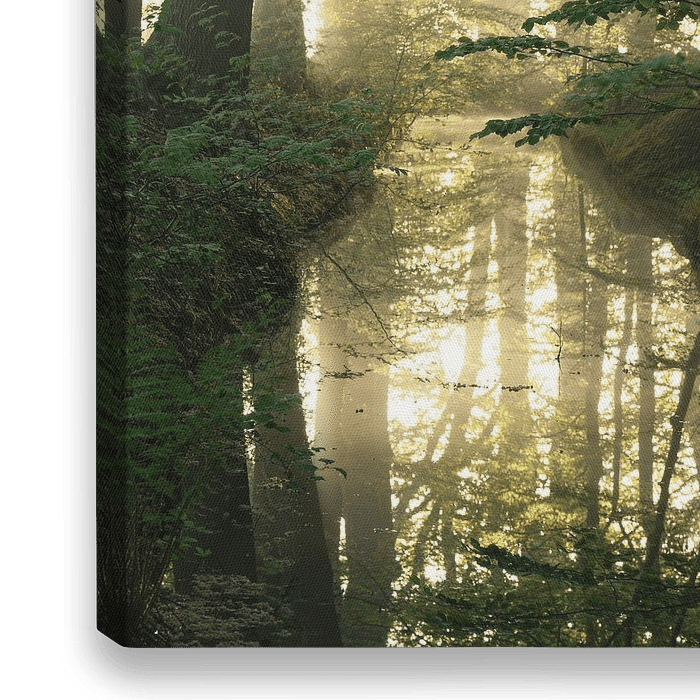Une belle forêt verte se reflétant dans un étang pendant un beau lever de soleil brumeux. Une belle ambiance estivale dans la Drenthe.