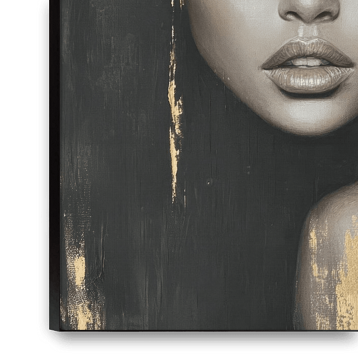 Ce portrait respire la force et l'élégance. La femme est représentée vêtue d'un foulard doré qui enveloppe son visage comme une couronne, rehaussant son éclat. Ses boucles d'oreilles en or et ses yeux radieux, qui reflètent la chaleur des teintes dorées, rendent son expression à la fois mystérieuse et irrésistible. Le fond sombre la met…