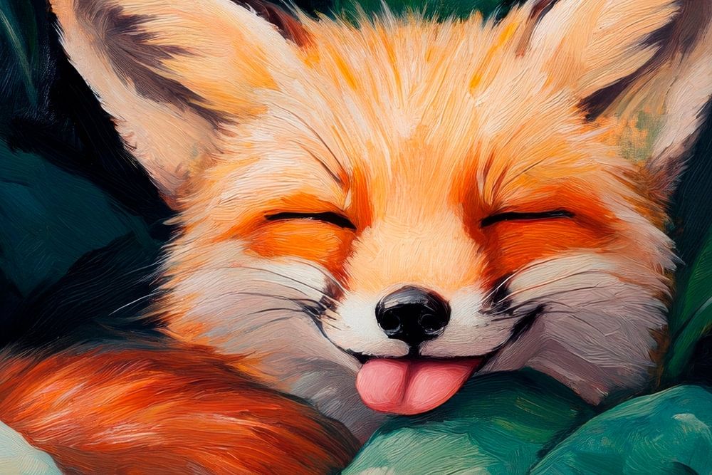 Avec un large sourire et une langue tirée avec audace, un renard orange éclatant se blottit dans l'étreinte verte des feuilles. Des coccinelles rouges ajoutent des accents joyeux à la flore dense, tandis que les yeux du renard pétillent de satisfaction - une image pleine de joie de vivre et d'harmonie naturelle.