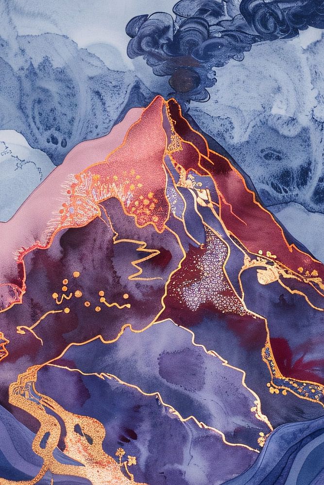 Cette œuvre d'art unique représente une impressionnante éruption volcanique dans un paysage stylisé plein de couleurs et de dynamisme. Les teintes contrastées de bleu profond, de violet et d'orange dépeignent magnifiquement la puissance ardente de la nature. Des panaches de fumée s'élèvent, menaçants, dans un ciel atmosphérique, évoquant un sentiment de mouvement et d'énergie. Les lignes ondulées et les détails délicats font de cette œuvre d'art un véritable accroche-regard pour n'importe quelle pièce. Qu'il soit accroché dans un salon, un bureau ou un lieu de travail créatif, ce motif crée une atmosphère puissante et inspirante. Idéal pour les amateurs d'art moderne et abstrait.