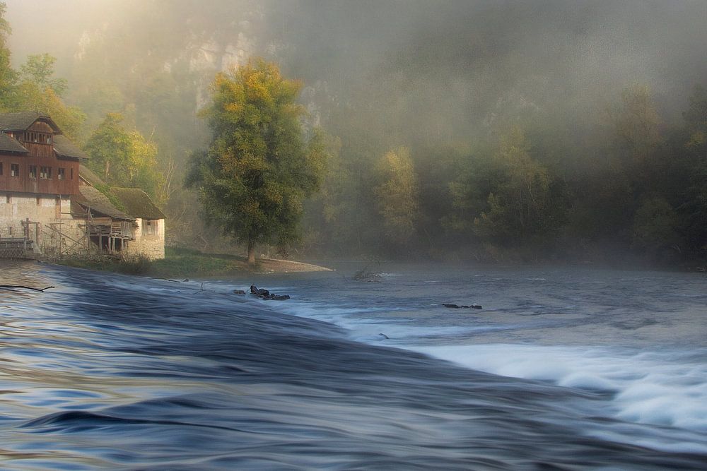 La rivière Kupa avec de l'autre côté le vieux moulin à eau en Slovénie.