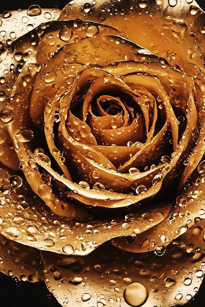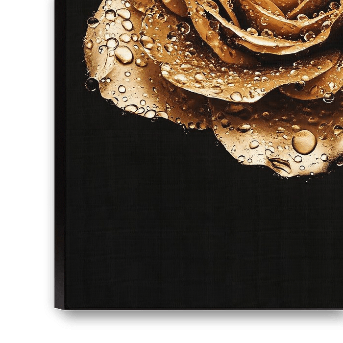 Cette image montre une rose unique recouverte d'une couche métallique dorée et de délicates gouttes d'eau glissant sur les pétales. Le contraste entre l'or éclatant et les gouttes subtiles crée un aspect luxueux et sophistiqué, parfait pour les amateurs de décoration élégante et intemporelle. Cette œuvre d'art s'intègre bien dans un intérieur moderne, mais peut également être un ajout chic dans une pièce décorée de manière classique. La texture détaillée de la rose et les éclats de l'or en font un ajout visuellement attrayant à n'importe quel mur.
