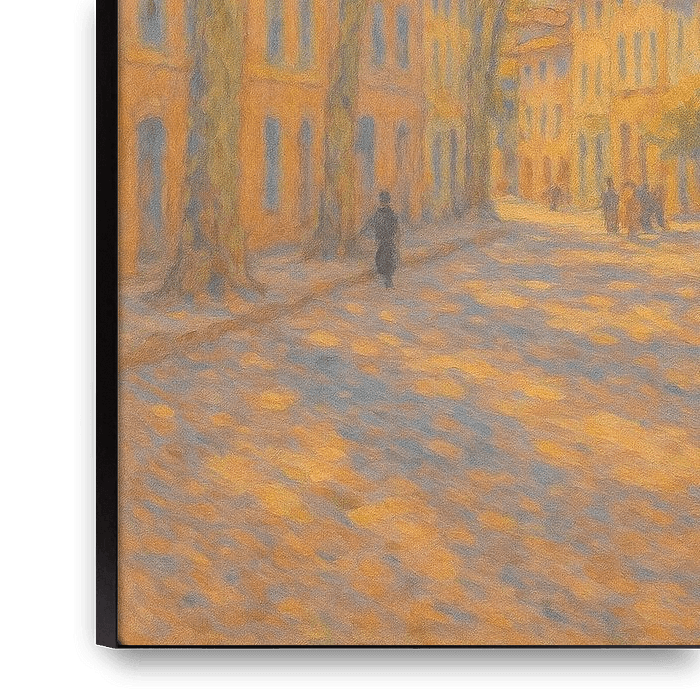 À propos de ‘Rue d'Aix-en-Provence éclairée par le soleil - Peinture impressionniste chaleureuse d'une ville européenne’ par Travel Shop