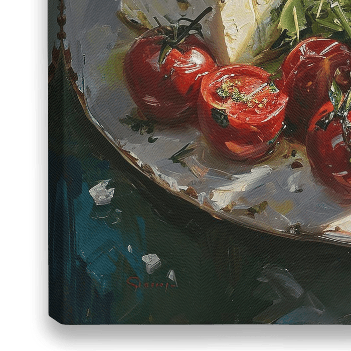 Salade grecque - Cette peinture à l'huile vibrante montre une interprétation abstraite d'une salade grecque, avec un fromage feta central entouré de tomates colorées et de tranches de concombre juteuses, le tout agrémenté d'herbes vertes fraîches. La texture riche et les coups de pinceau dynamiques donnent vie à la fraîcheur et à la…