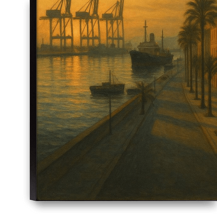 Santa Cruz Amber Glow capture le calme du port de Ténériffe alors que le soleil plonge au-delà de l'horizon atlantique. La lumière douce transforme le front de mer en or liquide - grues, navires et palmiers peints dans de chaudes teintes ambrées. La géométrie tranquille du port contraste avec le calme immense de l'océan, tandis qu'une…