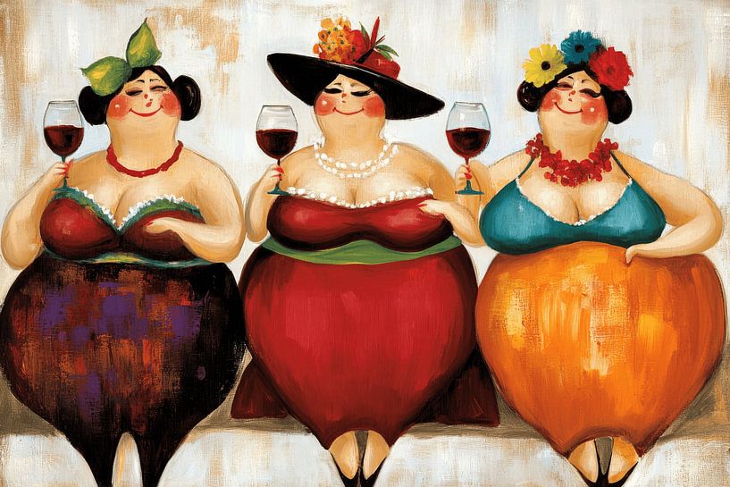 Proost, une peinture joyeuse de trois amies, des grosses dames, qui lèvent toutes les trois un verre de vin et trinquent à la vie ensemble. Un accroche-regard amusant pour votre intérieur !