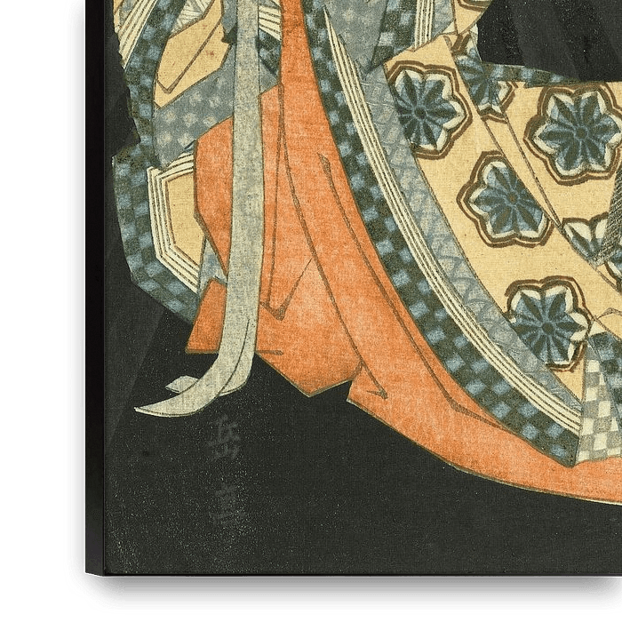 Une femme porte un somptueux kimono, dans sa main un éventail plié. Les trois dieux de la poésie japonaise (Wakasanjin) sont trois poètes de grand prestige. Avec un seul poème.