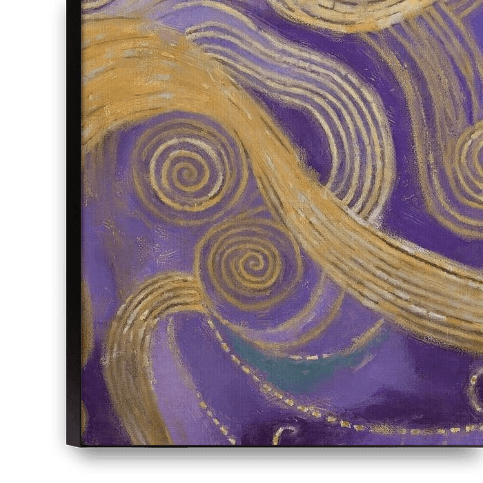 Cette œuvre présente un mélange captivant de lignes ondulées et de motifs circulaires en or et en violet. Le haut de l'œuvre est parsemé de nombreux petits cercles dorés qui se transforment progressivement en spirales plus grandes vers le bas. Le fond violet offre un beau contraste, faisant ressortir encore plus les spirales dorées et…