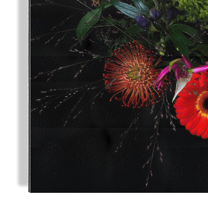 Bouquet de fleurs colorées sur un fond noir aux couleurs chatoyantes. L'image a une forme carrée.