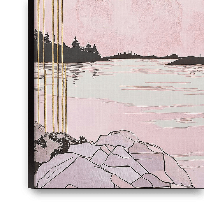 Une scène rose et dorée de Stockholm dans le style de l'art chinois, avec une lune dorée dans le ciel, entourée de nuages blancs. La surface de l'eau est calme, avec des arbres de chaque côté. Dans la mer se trouve une île qui reflète des nuances de vert clair et de gris. Sur un côté de la scène se trouve un cadre décoratif simple,…