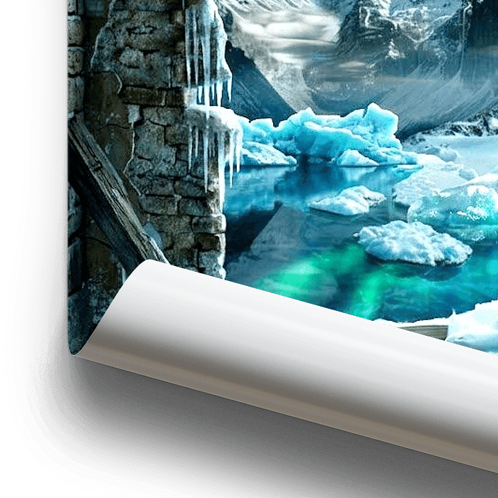 Cette composition numérique transporte le spectateur dans un monde où les frontières entre réalité et imagination s'estompent. À travers les décombres d'un mur de pierre en ruine, on aperçoit un spectacle naturel cosmique. De longs glaçons pointus pendent du mur fissuré comme des larmes figées, encadrant la scène. Au cœur de cette…