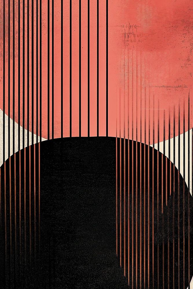 Cette œuvre d'art abstraite allie précision géométrique et puissance visuelle. Un cercle rouge dominant contraste avec un cercle noir plus petit, entrecoupé de lignes verticales qui suggèrent le mouvement et la profondeur. Les textures dans les cercles ajoutent du toucher, tandis que le fond beige offre de la tranquillité. L'interaction du rouge chaud et du noir profond crée tension et harmonie. La composition invite à une réflexion sur la dualité et l'équilibre, où la suggestion de mouvements cosmiques ou de rythmes musicaux stimule l'imagination. L'œuvre incarne l'élégance intemporelle de l'art abstrait moderne.