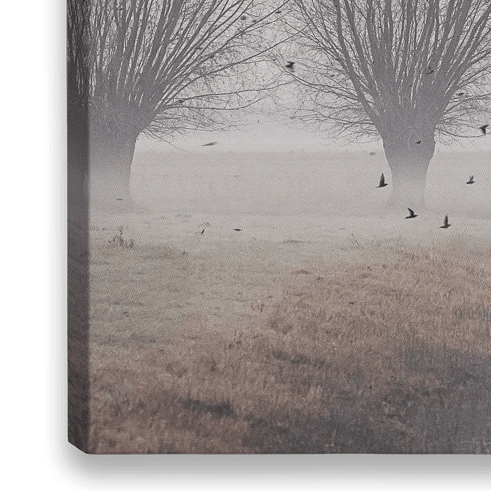 Paysage d'hiver avec des saules têtards et un essaim d'étourneaux.