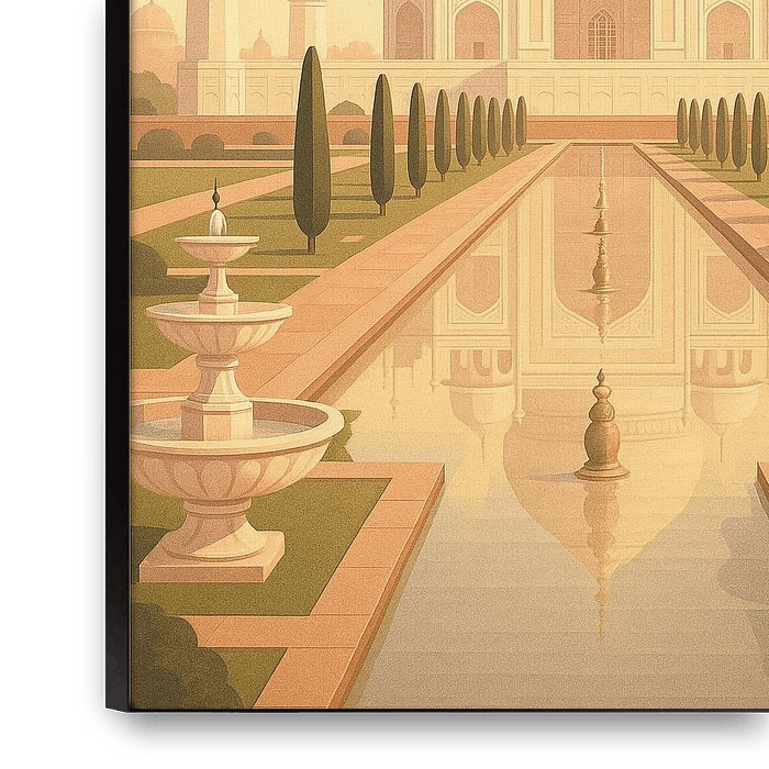 Achetez cette œuvre d'art de paysage Taj Mahal Vintage Travel Poster - Agra Sunrise &amp ; Reflection Art par Travel Shop sur toile, aluminium, ArtFrame ou photographie (encadrée), impression d'art en haute qualité et tout format.