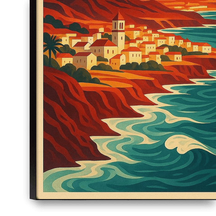 Cette affiche Art déco de Tenerife met en valeur la beauté spectaculaire des îles Canaries, avec le mont Teide s'élevant majestueusement au-dessus du littoral accidenté de l'île. Les couleurs rouge et orange mettent en valeur le paysage volcanique, tandis que les bleus profonds de l'Atlantique créent un contraste saisissant. Les rayons…