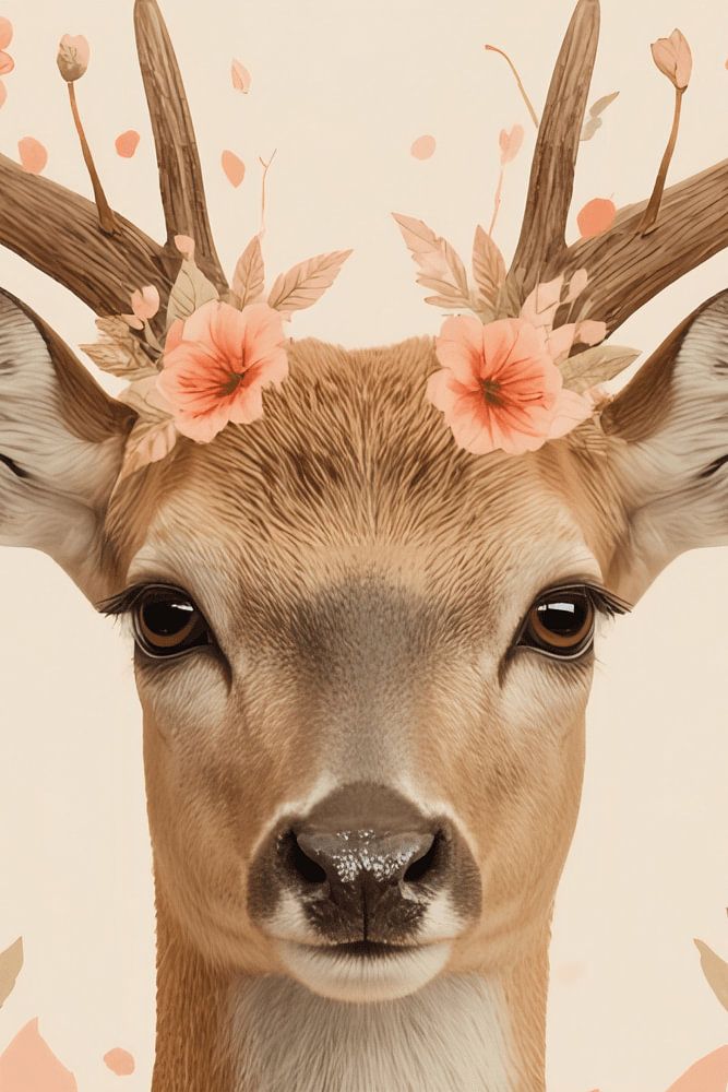 Illustration d'un cerf avec des bois, orné de fleurs de couleur pêche, sur un fond de couleur pêche claire avec des accents floraux.