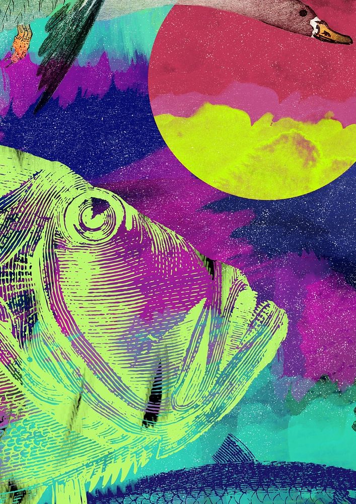 Des poissons au néon, des couleurs vives, des canards qui volent au-dessus de nos têtes et un bateau de pêche. Pour beaucoup, il y a trop de choses dans cette photo. J'aime remplir une toile, avec quelque chose de nouveau à voir dans chaque coin.