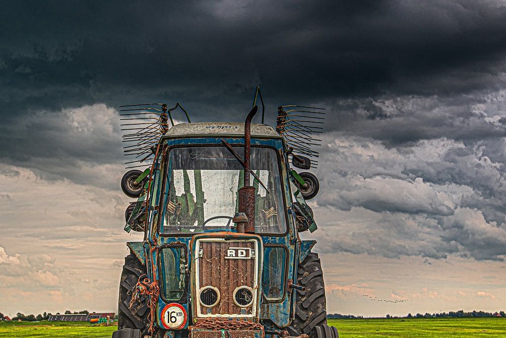 Un vieux tracteur, presque historique, dans le paysage d'herbe frisonne avec un nuage lourd, presque noir, au-dessus de lui.