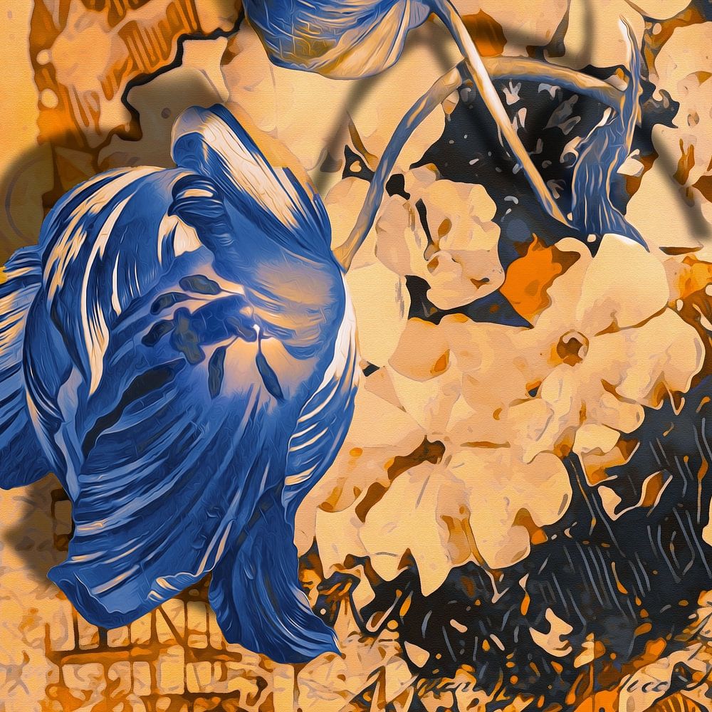 Les tulipes de l'art, dans ce cas, s'entendent au sens propre, bien qu'elles puissent également s'entendre au sens figuré, car les tulipes sont bien sûr des fleurs merveilleusement belles et élégantes. Ici, elles proviennent littéralement d'une œuvre d'art. Cette œuvre d'art contient tant de détails. Elle va des textes aux fleurs. On y trouve par exemple la verveine, ainsi que de nombreuses textures réalisées au pinceau et à la plume. Les tulipes classiques et élégantes semblent sortir tout droit de l'arrière-plan. Avec un panache élégant et grandiose, elles émergent pour se présenter à vous. La lumière venant de la droite projette une ombre claire sur l'arrière-plan, ce qui montre clairement qu'elles s'avancent vraiment et qu'elles sont donc généreusement en avant de l'arrière-plan. La lumière est chaude, comme celle du dernier soleil d'été, et les couleurs chaudes sont donc l'orange, le beige, le jaune, le bleu, le cyan et le camel. Cette œuvre apporte chaleur et atmosphère à la maison.