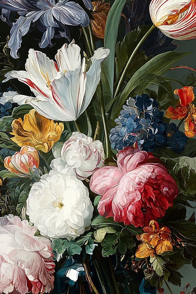 Une nature morte de style classique, où tulipes colorées, roses luxuriantes et diverses fleurs sauvages se rassemblent dans un élégant vase bleu. La composition est animée par le vol des papillons et agrémentée de pêches juteuses et de baies rouges sur un plateau en pierre. Le fond sombre renforce l'effet dramatique de ce chef-d'œuvre intemporel.