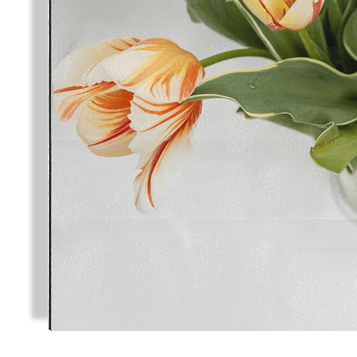 Avec ces magnifiques tulipes, vous aurez le printemps dans votre maison pour toujours. Les tulipes blanc-rouge-orange avec les tiges vertes dans un vase en verre forment une belle combinaison de couleurs. Cette nature morte d'art floral ne dépareille sur aucun mur.