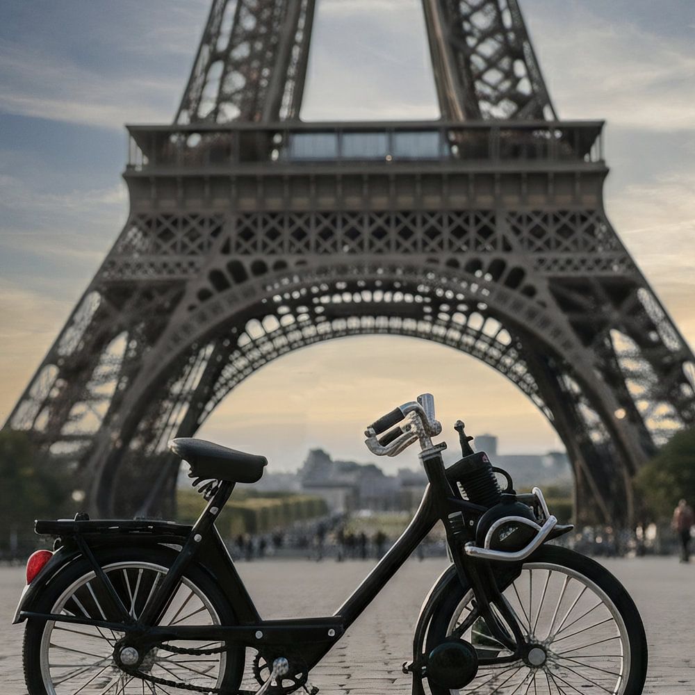 Une charmante nature morte stylisée capture l'emblématique Tour Eiffel* à Paris au coucher du soleil. Au premier plan se trouve une **cyclomoteur noir classique en solex** ou un vélo, parfaitement centré sur les **pavés rugueux**. La composition joue avec la **profondeur de champ**, ce qui permet à la tour de se dresser majestueusement…