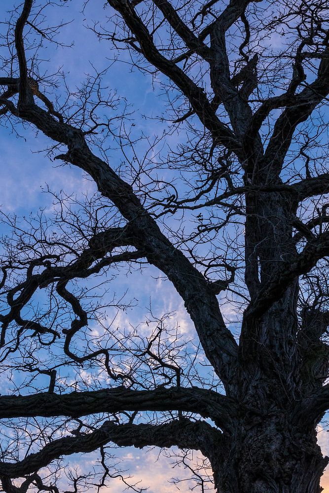 Grand arbre nu en hiver dans un ciel bleu-orange